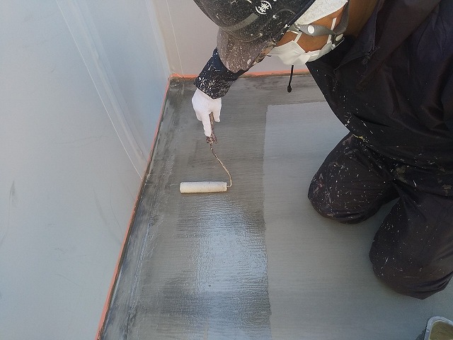 下地と新しい防水層との接着性を高めるため、床の全面にプライマーを塗布します。