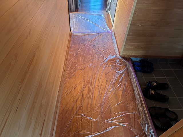 その際、床を汚さないよう、玄関からベランダまでの経路に、マスカーやブルーシートなどを使い、しっかりと養生を施したうえで行っています。