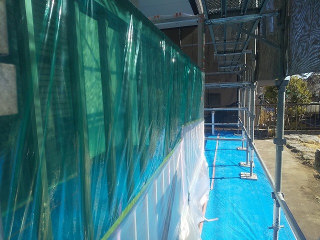 ・牛久市の事務所建物で折板屋根や笠木への塗装メンテナンス、足場設置と外周部養生